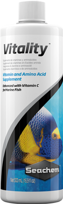 Vitality™ is a comprehensive vitamin, amino acid, and trace element supplement developed to address nutritional requirements commonly associated with long term closed system housing of marine ornamental fish. Vitality™ contains ascorbic acid in a heavy base of spirulina and chlorella. Ascorbic acid is a cofactor in the hydroxylation of proline and lysine to components of procollagen, the precursor of collagen, necessary for the formation of connective tissues, scar tissue in wound repair, and bone matrix.* Both spirulina and chlorella contain a rich assortment of amino acids and vitamins. Vitality™ can be used on freshwater ornamental fish; however, it is specifically designed for marine fish.